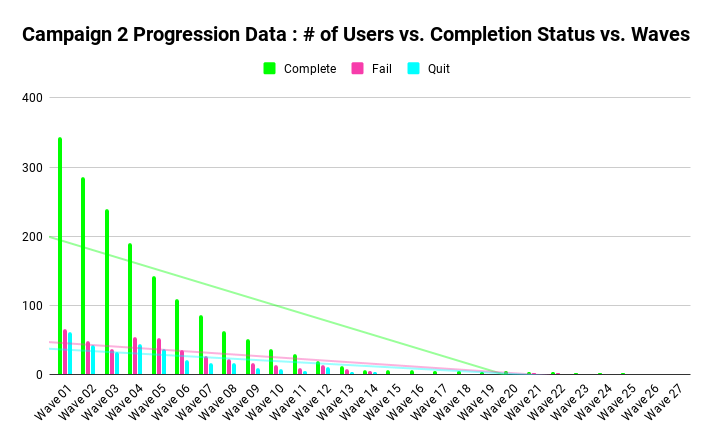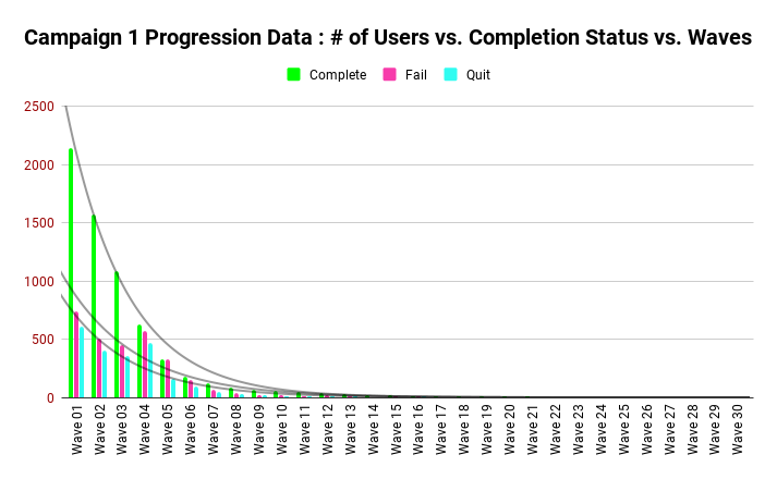 After the summer, I continued work on Roller Riot as the producer. Now instead of focusing on building the game, we were looking at how people played the game. We wanted to understand why people would stop playing, and how we could get them to play longer and multiple times. A big thing we focused on was fixing the game’s difficulty curve. We had four ad campaigns for Roller Riot, and each time we’d change something about the game. For the first campaign we just launched the game to see the current state of the game. On the second campaign we changed how enemies indicate when they can be hit. Before when they were in range they’d get blue afterimage-like effects. For this campaign we changed it to radars appearing on their heads, which helped a lot. For the third campaign we’re changing which waves enemies will spawn on, because we’re worried the player is getting overwhelmed too fast. Here are all the graphs: